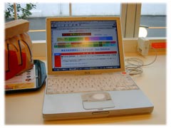 イルの画面にはボーイング747の画像が・・・さすが・・。画像左が、ビルの裏側の塀ごしに電波を受信しているところ。Aが私のiBook。クリックする