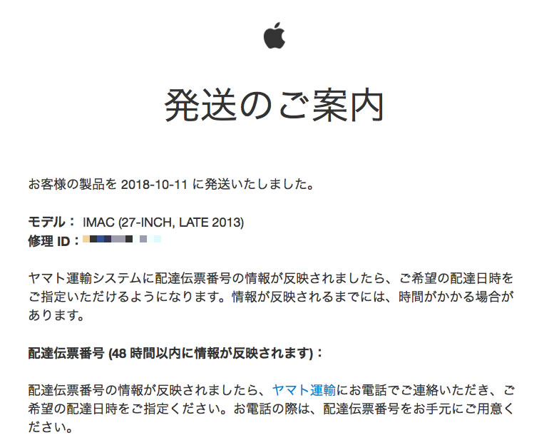●新iMac研究 106 配達伝票番号が空白 10月11日(木)Appleから27インチiMacの修理が終了して発送したとメールをもらったが、配達伝票番号が空白・・・。どうしてヤマト運輸に問い合わせしたらいいの・・・。Appleさんしっかりしてよ・・・・。それでAppleサポートに電話したらもう発送してしまっているのでわからないとのこと・・不在連絡票が入っていたら問い合わせして下さいとの返答???なんて不親切な対応。親戚に不幸事があって家を空けるかもしれないのに・・・ ![]() |